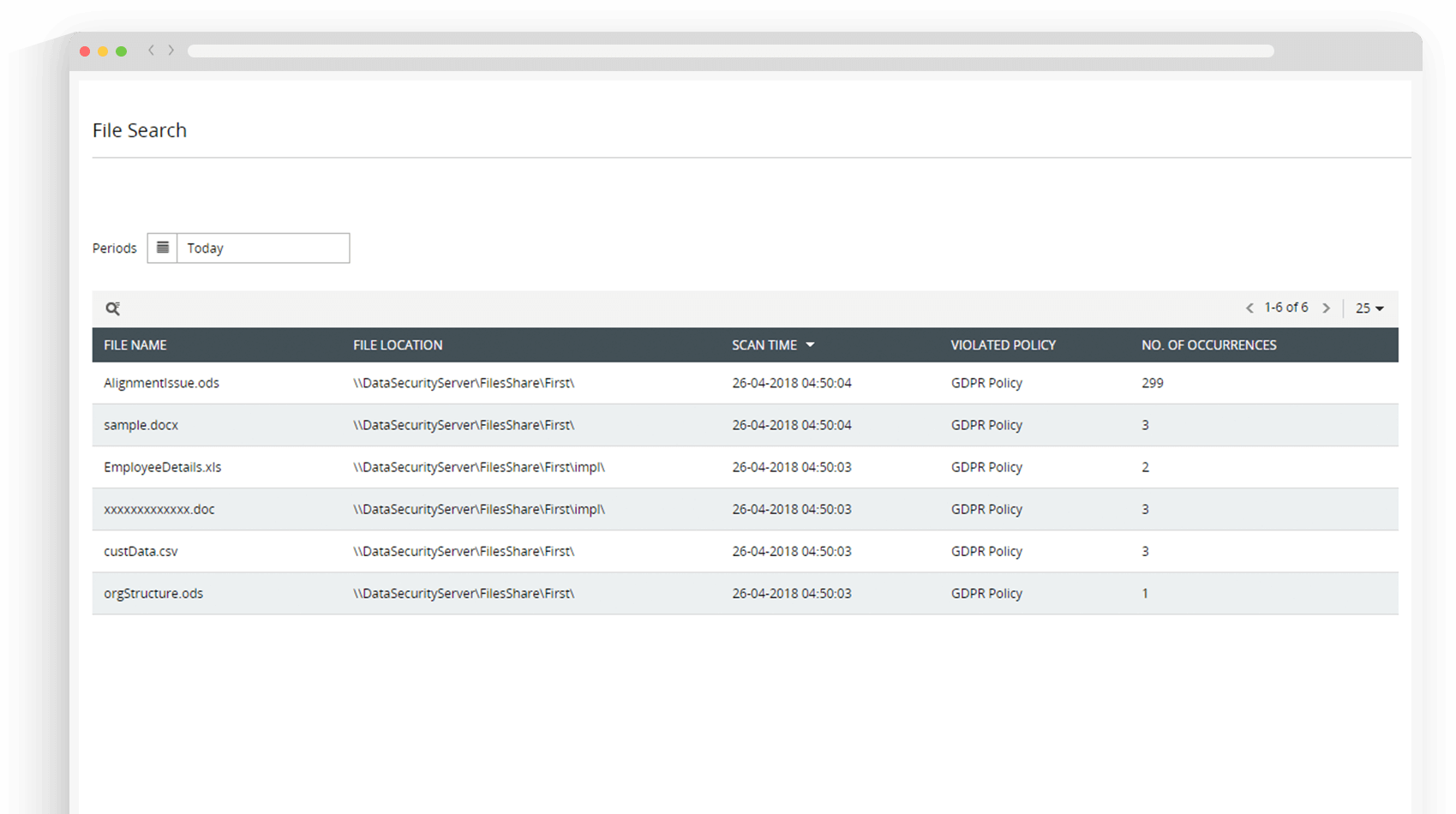 Visualisez des rapports intuitifs sur les différentes occurrences de données personnelles, incluant le type, l'emplacement et la quantité de données personnelles stockées dans chaque fichier.