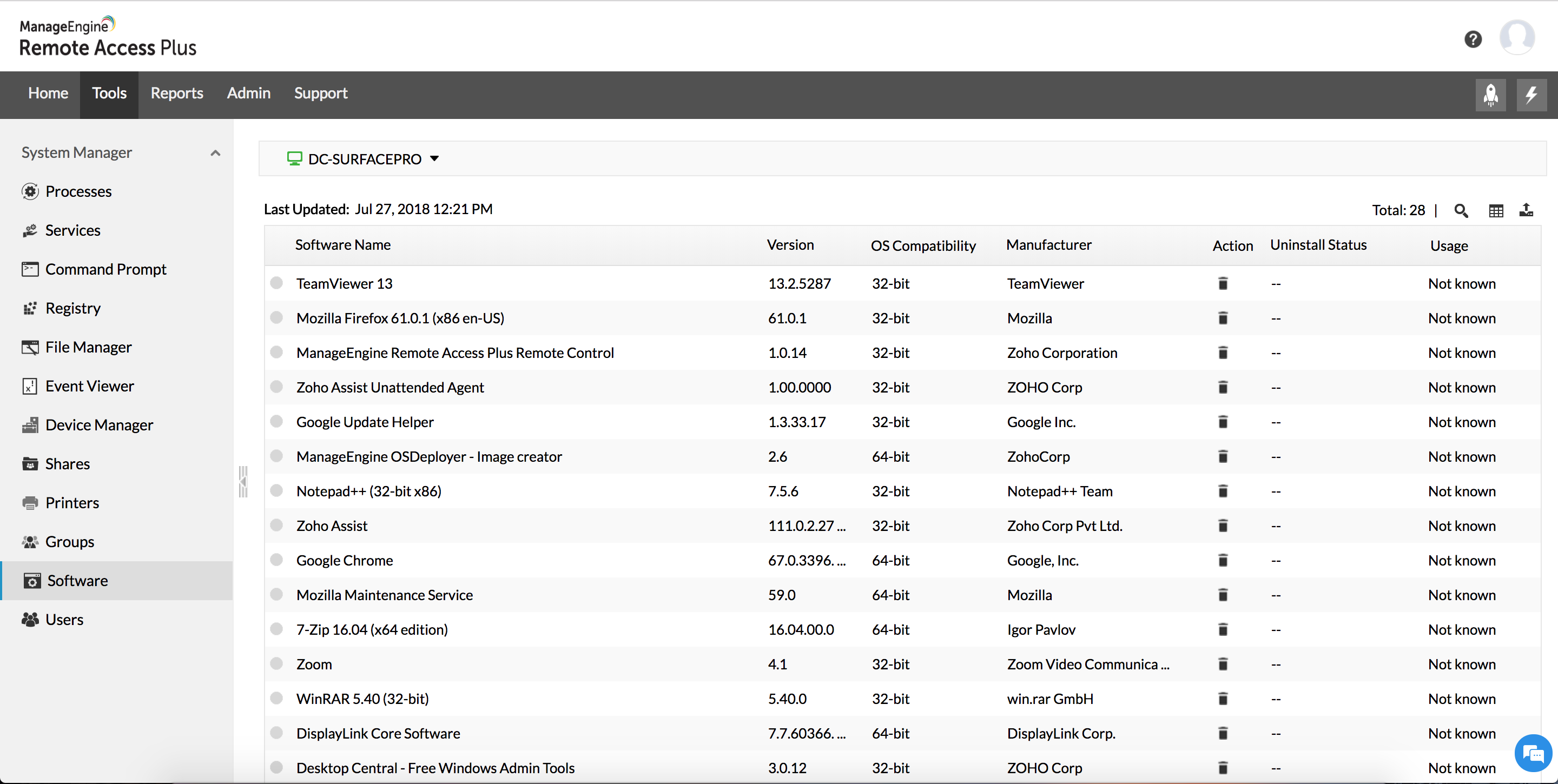 Explorez la liste de tous les logiciels installés sur n'importe quelle machine du réseau et désinstallez les logiciels à distance des ordinateurs en quelques clics.